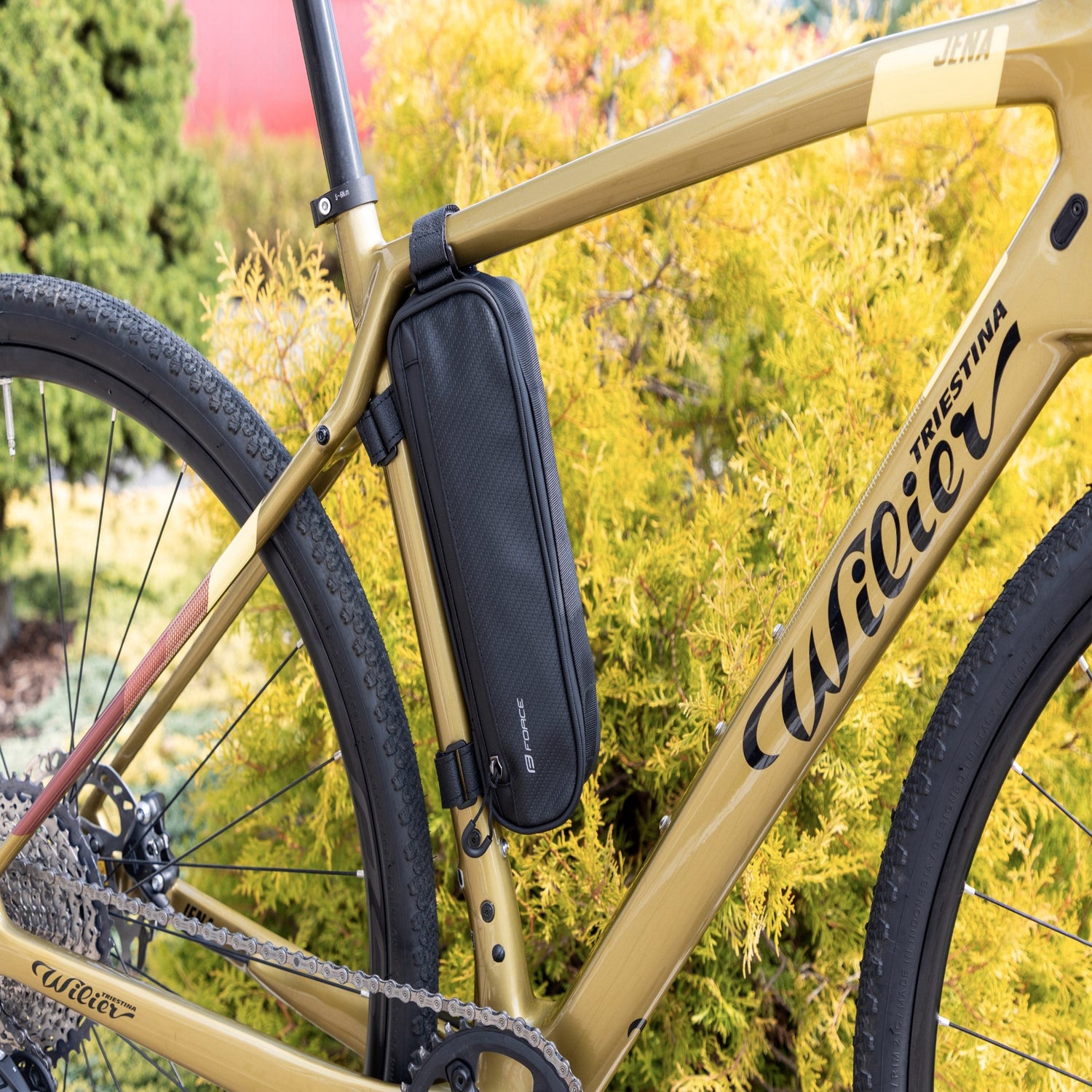 The FORCE Bag Frame QUAD in black is a water-resistant frame bag designed for cyclists seeking a practical and durable storage solution. Please note, this bag is water-resistant but not fully waterproof, so it provides protection against light moisture but should be kept away from heavy rain or submersion. It features secure fastening with Velcro straps, ensuring a snug fit on your bike frame without slipping or shifting during rides. Made from easily washable tarpaulin material, this bag is simple to clean and maintain, keeping it looking fresh after many adventures. With a capacity of approximately 1.7 liters, it offers ample space for carrying essentials like tools, snacks, or small personal items. Its dimensions are 43 cm in length, 6.5 cm in width, and 13.5 cm in height, making it a compact yet efficient storage option. Weighing just 210 grams, it adds minimal weight to your bike, making it ideal for both casual and competitive riders. For a complete set, we also suggest purchasing bags 896043 and 896044, which complement the FORCE Bag Frame QUAD perfectly to meet all your on-the-go storage needs.