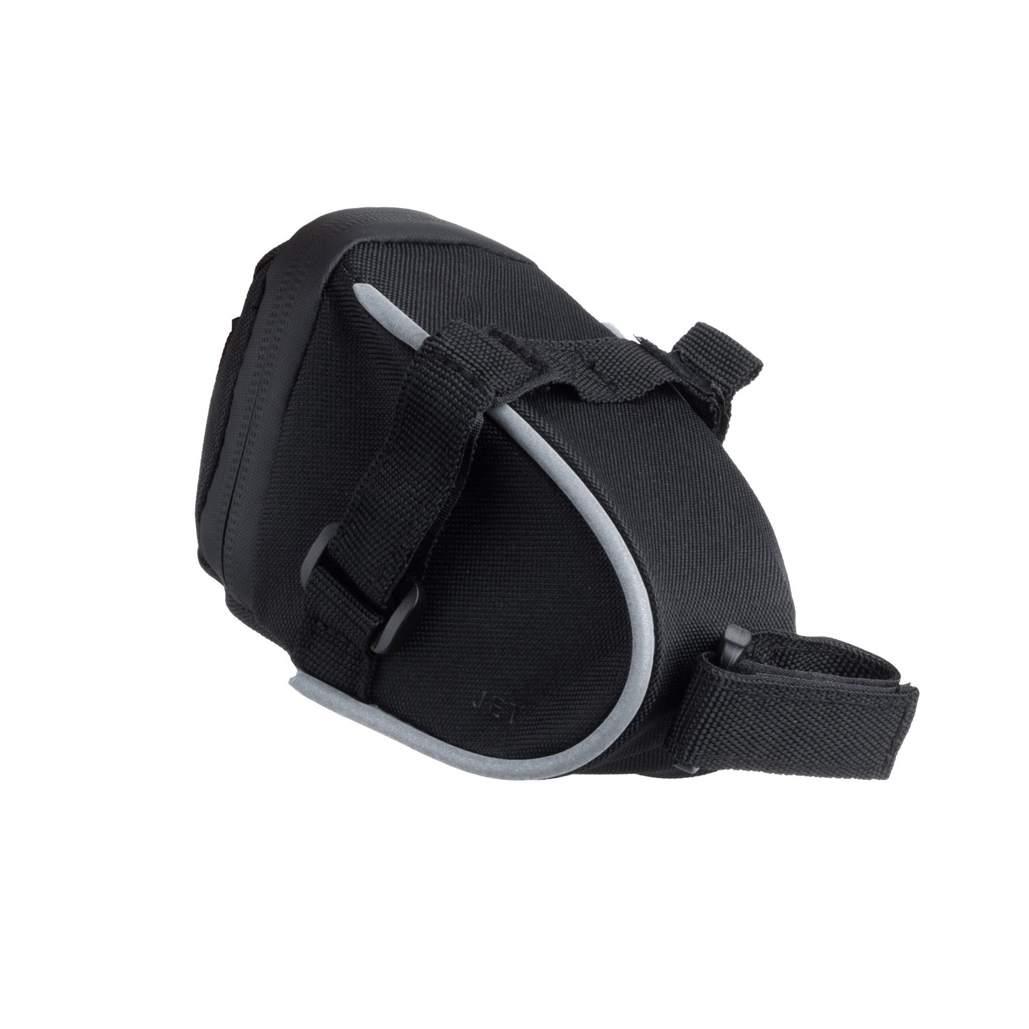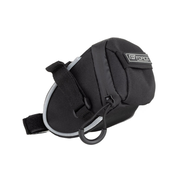 The FORCE JET seat bag is a compact and waterproof storage solution designed to fit securely under your saddle and attach easily to the seat post using durable Velcro straps. Crafted from robust polyester material, this sleek black bag offers reliable protection against the elements, keeping your essentials safe and dry during rides. Reflective accents enhance visibility in low-light conditions, adding an extra layer of safety.