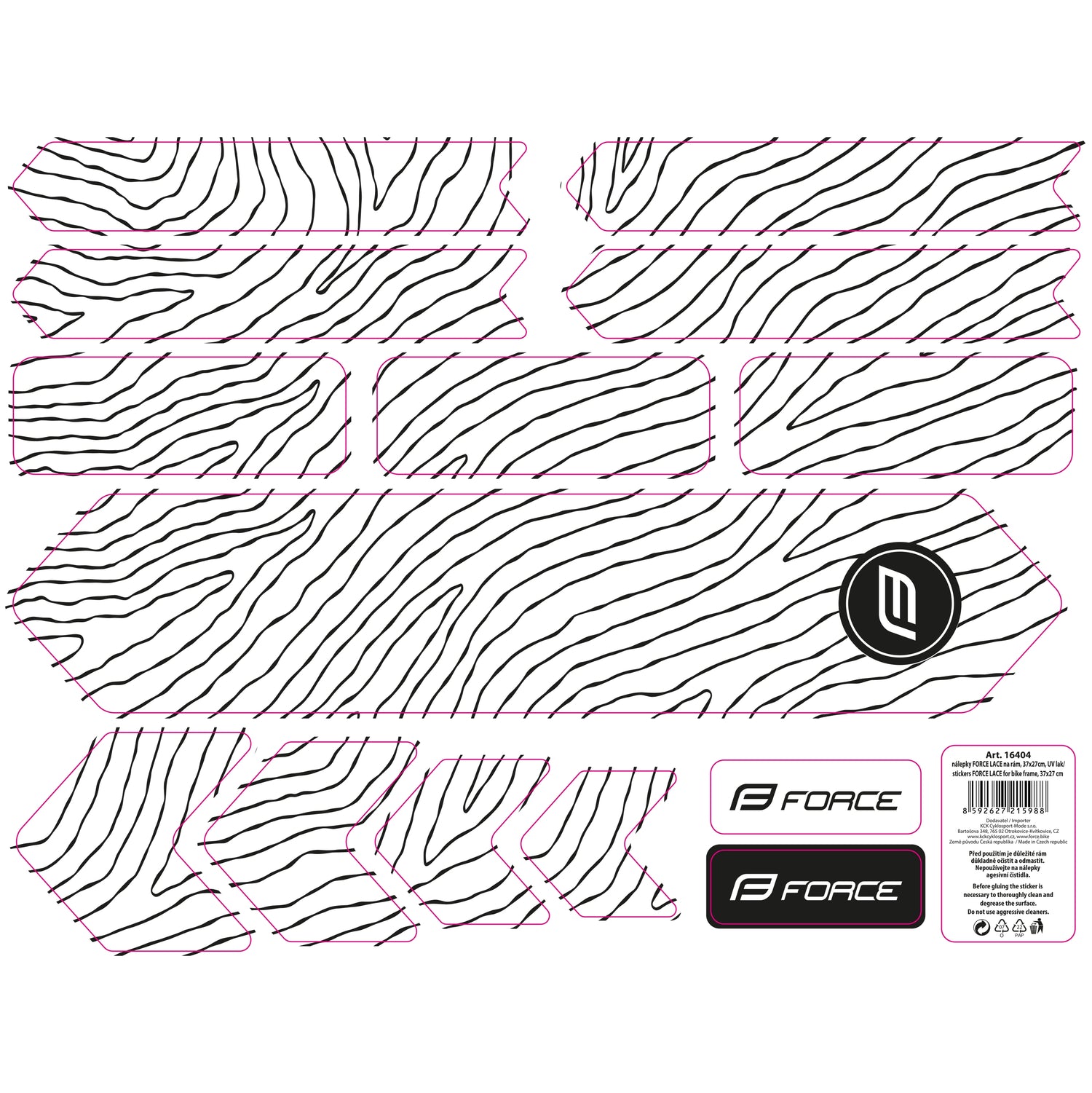 Introducing a set of 14 meticulously pre-cut FORCE LACE stickers designed to protect and personalize your bike frame. These high-quality decals come on a transparent backing, ensuring a seamless and professional application that preserves the original look of your bike while adding a stylish finish. With dimensions of 37 x 27 cm, this sticker set offers comprehensive coverage suitable for a wide range of bike frame shapes and sizes.